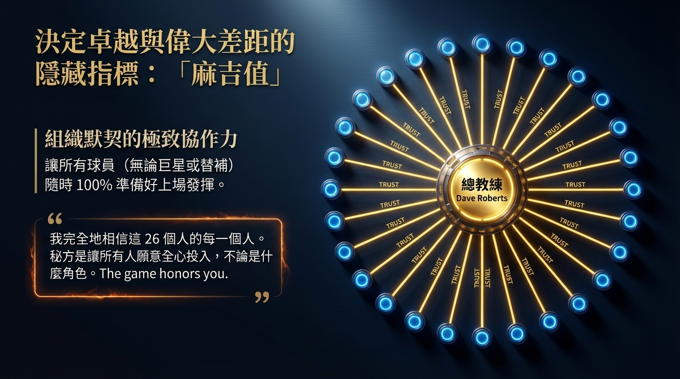 Dave Roberts 之所以厲害,不只是因為他會調度,而是因為他的調度建立在信任上。他能說「我完全相信這26個人的每一個人」,這句話的重量不在語氣,而在於球員真的相信這不是公關台詞。當總教練做出的關鍵決定能被整個休息室接受,當替補球員不因不是主角就鬆掉,當每一個人都預設自己隨時可能上場且應該準備好,那支球隊就會產生一種很可怕的穩定性:沒有人在等別人救,所有人都隨時可以成為答案。