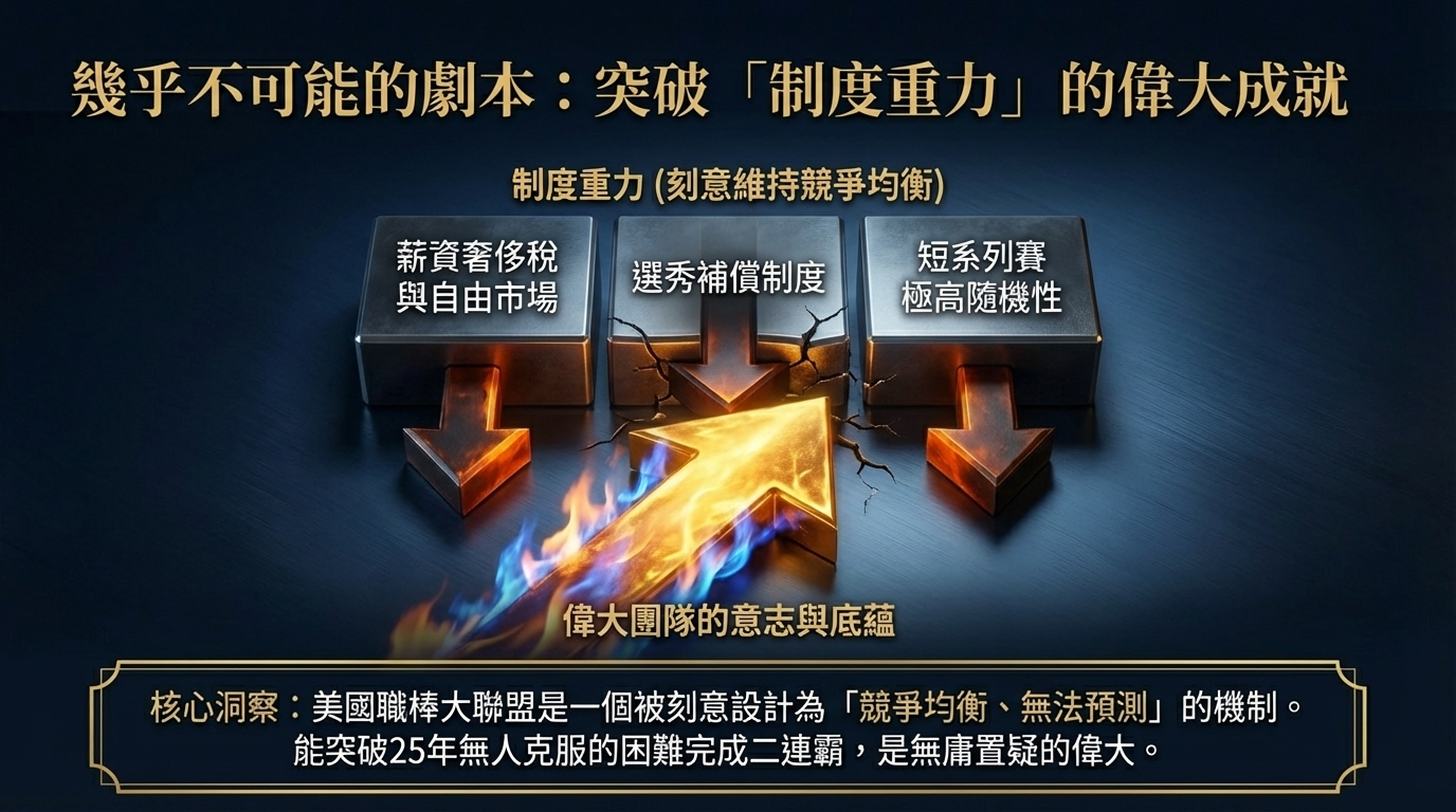 如果把大聯盟視為一個大型競爭系統,你會發現它從制度設計上,就不是為了讓王朝輕易誕生。薪資奢侈稅限制了無限擴張,球員自由流動削弱了冠軍班底的穩定性,選秀與補償機制則持續幫弱隊回血。再加上季後賽本來就是高波動、短樣本、充滿偶然性的戰場,一支球隊想拿一次冠軍已經很難,想連續兩年穿越同樣的亂流,那不是「再贏一次」而已,而是連續兩次擊敗整套不利於重複勝利的系統。
