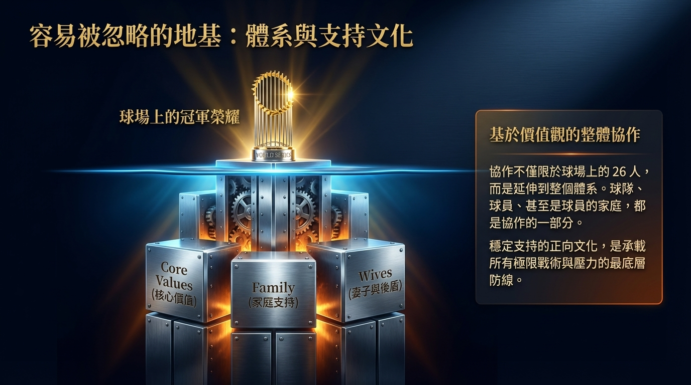 換句話說,偉大不是一場比賽的情緒高點,而是能在制度逆風、變數放大、對手研究更深之後,仍然站在山頂。當你理解了這一點,就會明白,接下來真正要問的問題不是「道奇有多強」,而是「偉大團隊到底是怎麼被造出來的」。
