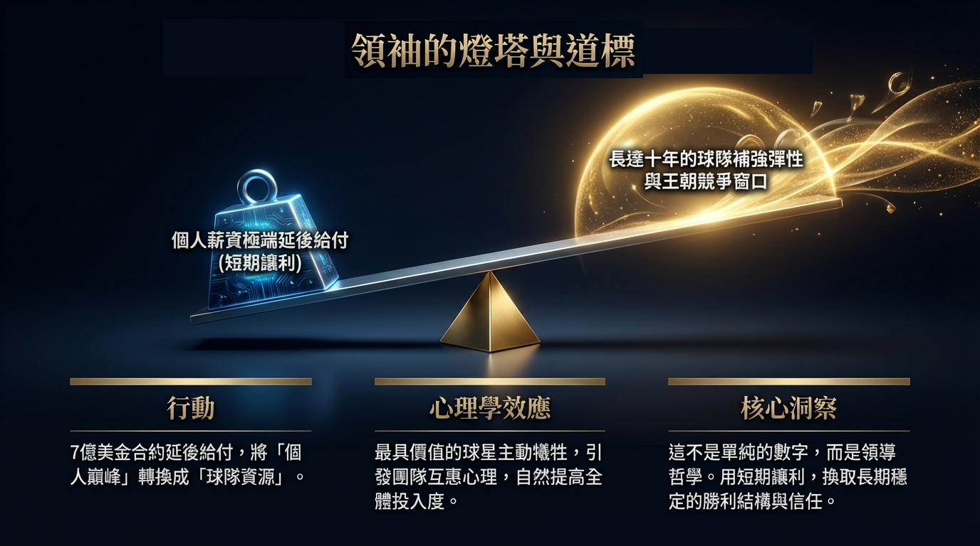 領袖的價值,不在於喊口號,而在於讓團隊看見「什麼叫做目標大於自我」。大谷翔平那份七億美元合約最震撼的地方,從來不只是數字,而是結構。他透過極大比例的延後給付,把原本屬於自己的即期利益,轉換成球隊當下的資源彈性。這不是單純的薪資設計,而是一種領導訊號:我不是只來這裡當最貴的明星,我是來和你們一起建立王朝的。