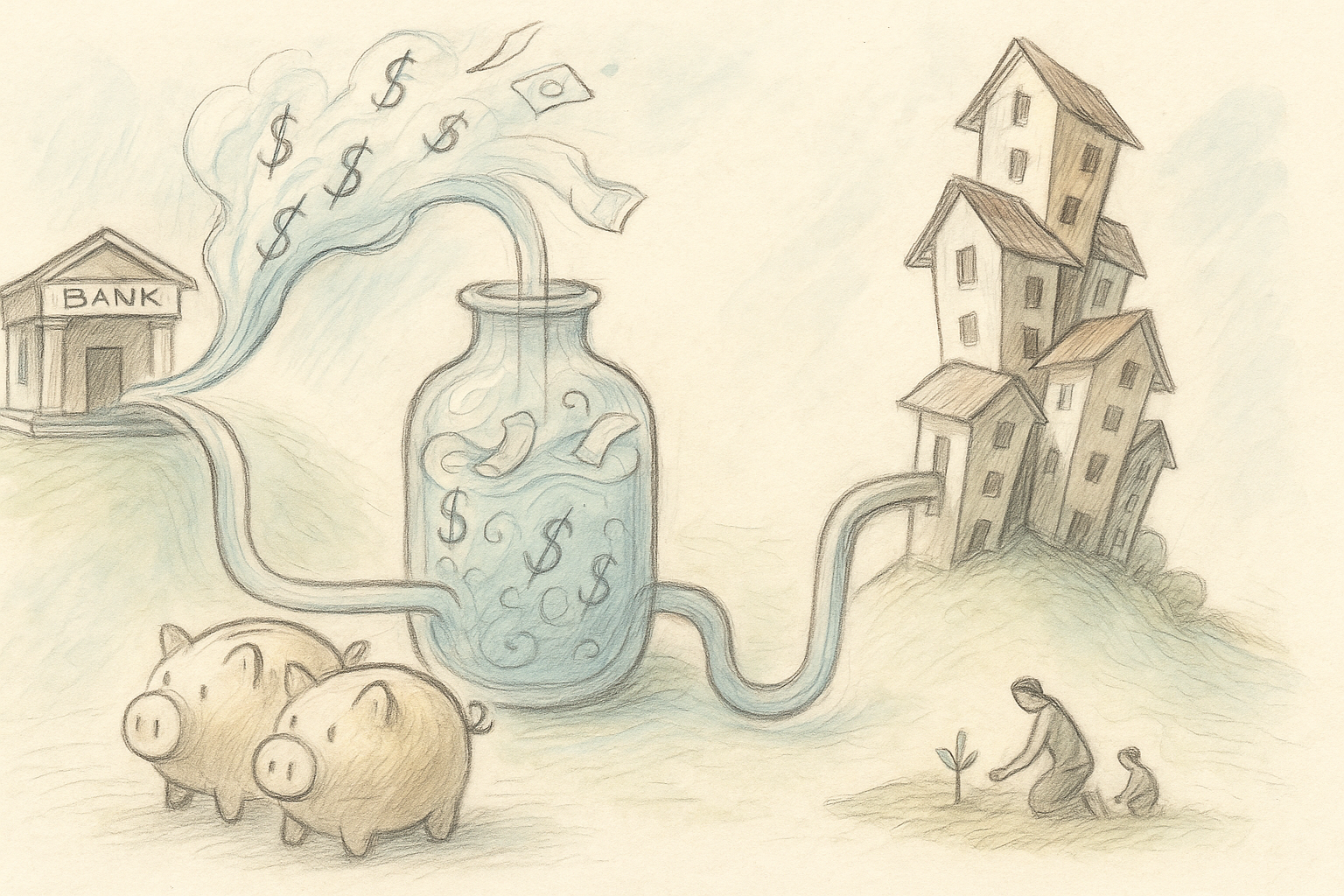 「匯率長期干預 → 外匯存底暴增 → 過剩流動性 → 利率被壓低 → 資金找出口 → 房價起飛」,這條因果鏈,一點都不玄學。當央行為了壓低台幣,不斷買進美元,就等於不斷把新台幣丟進系統,結果就是銀行體系躺著也變超肥,存款海嘯加上低利率,最後只會往兩個地方擠:房地產與金融市場。